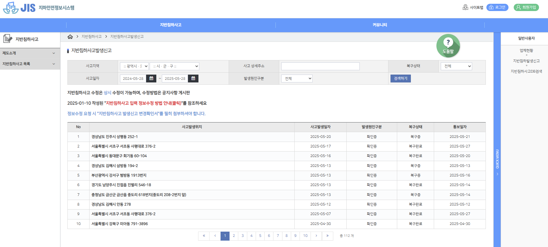 국토교통부는 지하안전정보시스템(JIS)을 통해 지반침하 위험지역 정보를 공개하고 있습니다.